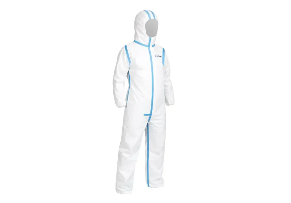 Tuta di protezione chimica in polietilene microporoso laminato con polipropilene.